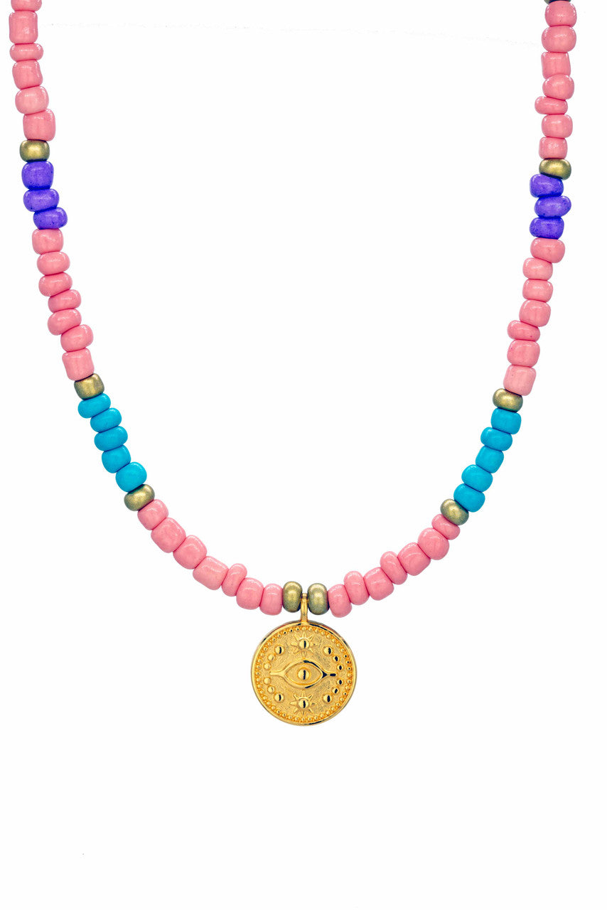 For a pop of girly boho style, slip on this beaded short necklace from our very own Tereza of Naxos. It's made up of multicoloured MUYUKI beads in a combinattion of Baby Pink, Turquoise and Violet colour for a standout and added glint and glimmer. Decorated with a centerpiece coin in bright gold, this pendant will put you ahead of this season's trends.