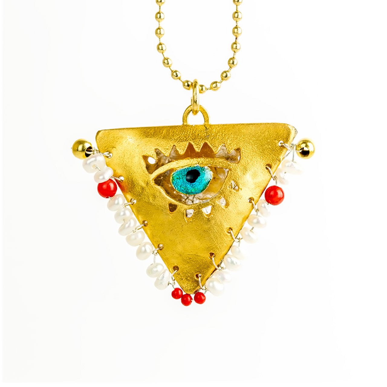 Transform your everyday style with our exquisite White Pearl and Passion Red Filakto Talisman Pendant—a stunning fusion of ancient Greek tradition and contemporary design. This handcrafted gold-plated silver necklace features an authentic triangular Filakto charm adorned with a protective turquoise evil eye, luminous white pearls, and vibrant passion red beads. Each pendant carries the heartfelt symbolism of protection and love that Greek grandmothers have bestowed upon newborns for generations, reimagined as a sophisticated accessory that brings both meaningful connection to heritage and elegant style to your jewelry collection.