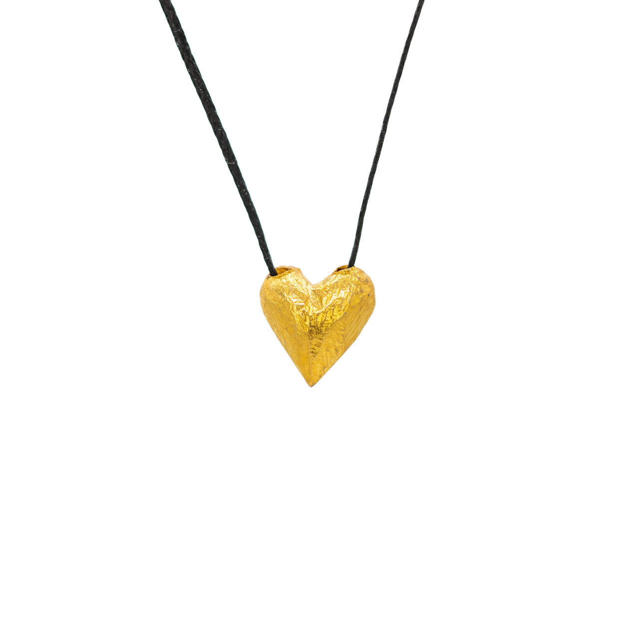 A one-of-a-kind, handmade, gold-plated necklace featuring a gold heart in a black, ultra-durable strap decorated with a light blue bead.