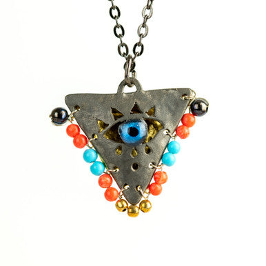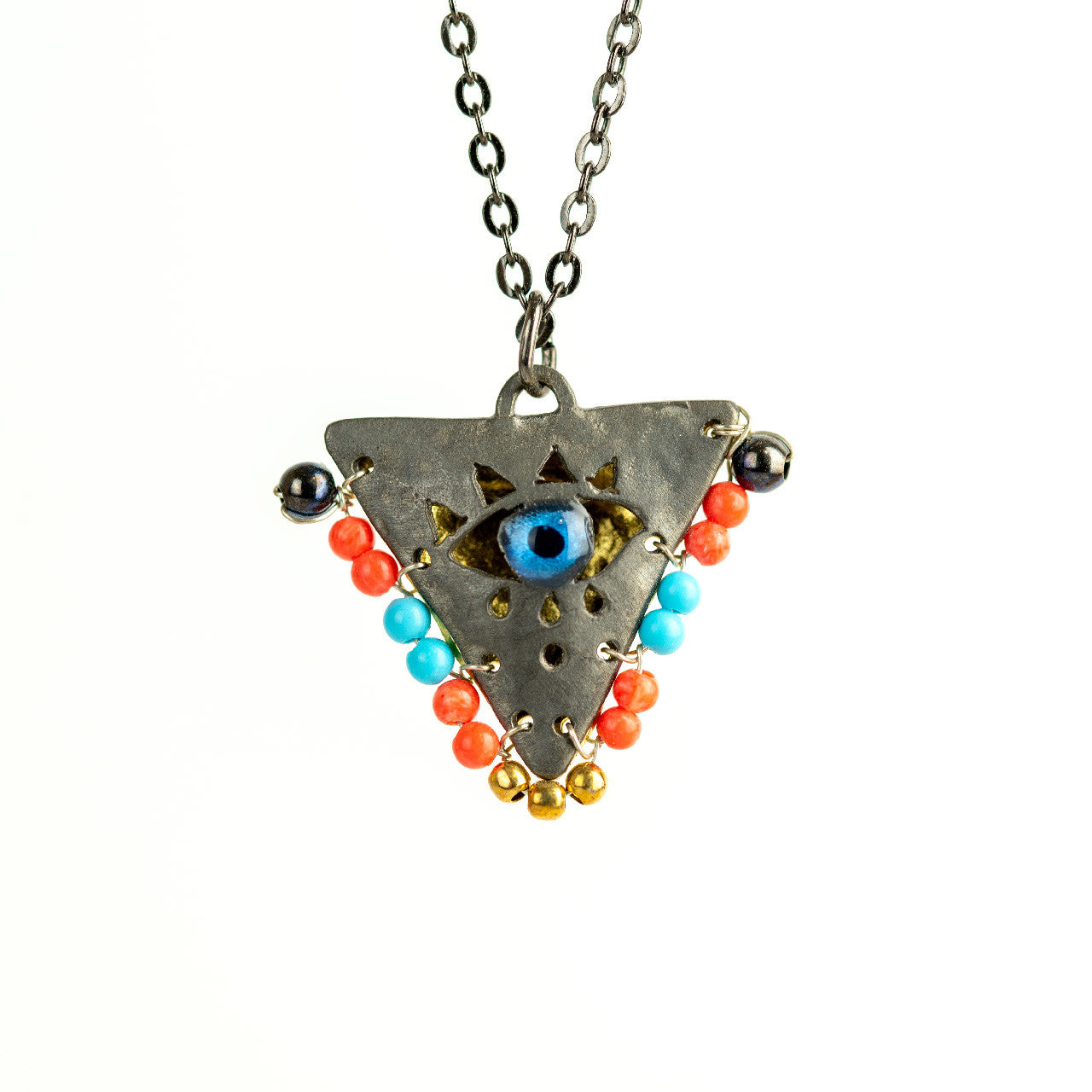 Limited edition, uniquely hand crafted pendant made in oxydized silver and decorated with gorgeous baby blue and coral red beads and centered with a dreamy rich blue evil eye.