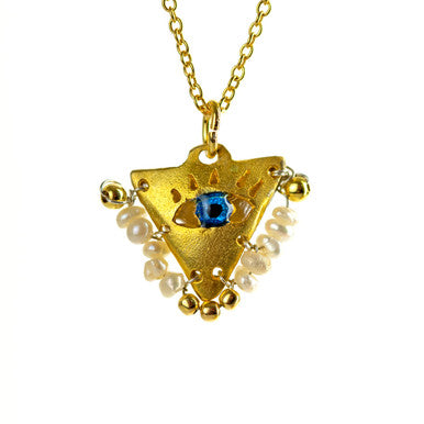 One of a kind, handmade, gold-plated necklace decorated with luxurious Freshwater Pearls and centered with a rich Blue evil eye.