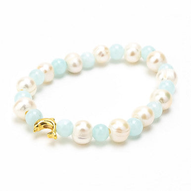 Pearls, Baby Blue Beads & Gold Dolphin Bracelet