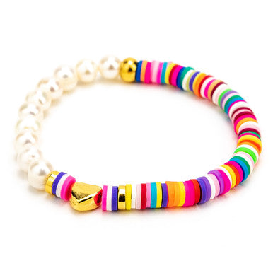 A wonderful and ultra playful combination of multicoloured beads and real freshwater pearls, centred with a gold plated heart, make this uniquely playful and girly bracelet that will be the talk of the table wherever you choose to appear.