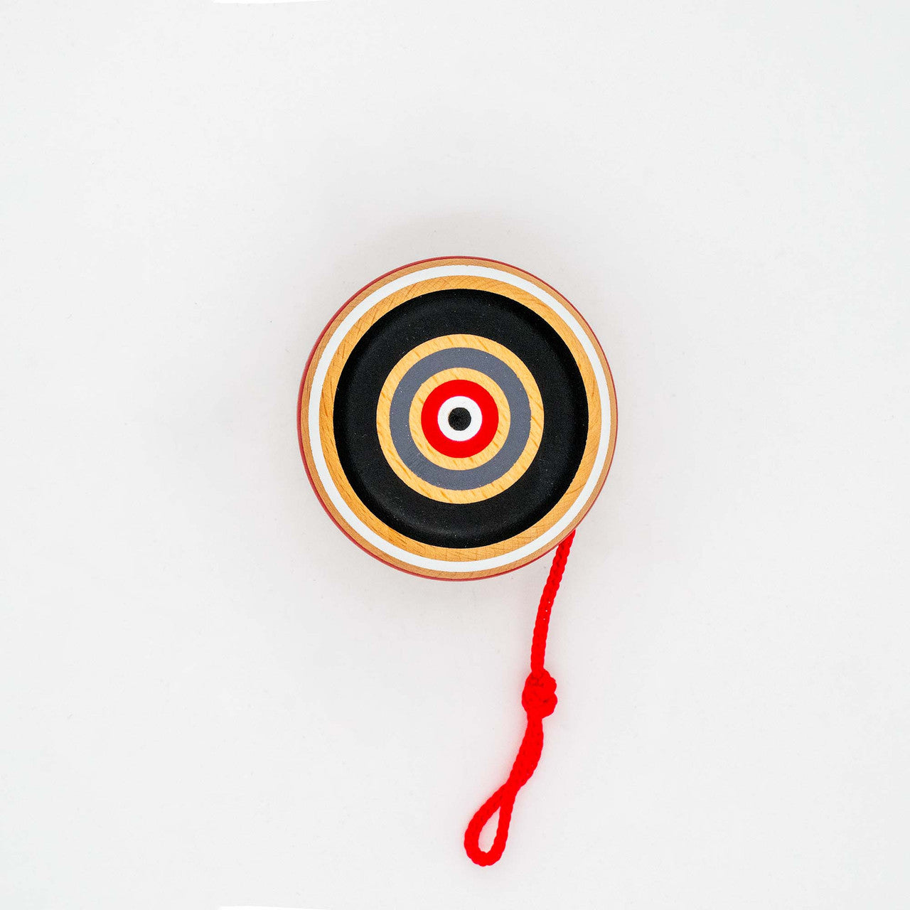 Set of three handmade wooden toys, hand painted and decorated with geometric motifs. Inspired by ancient Greek toys.