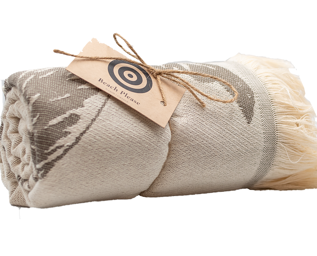 The "Tropical Beach" beach towel, from our own "Beach Please" brand, will be your happy place to go this summer, with its out-of-the-ordinary design featuring a calming depiction of a tropical setting somewhere lovely in the beige background and matching greige details.