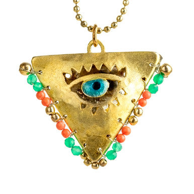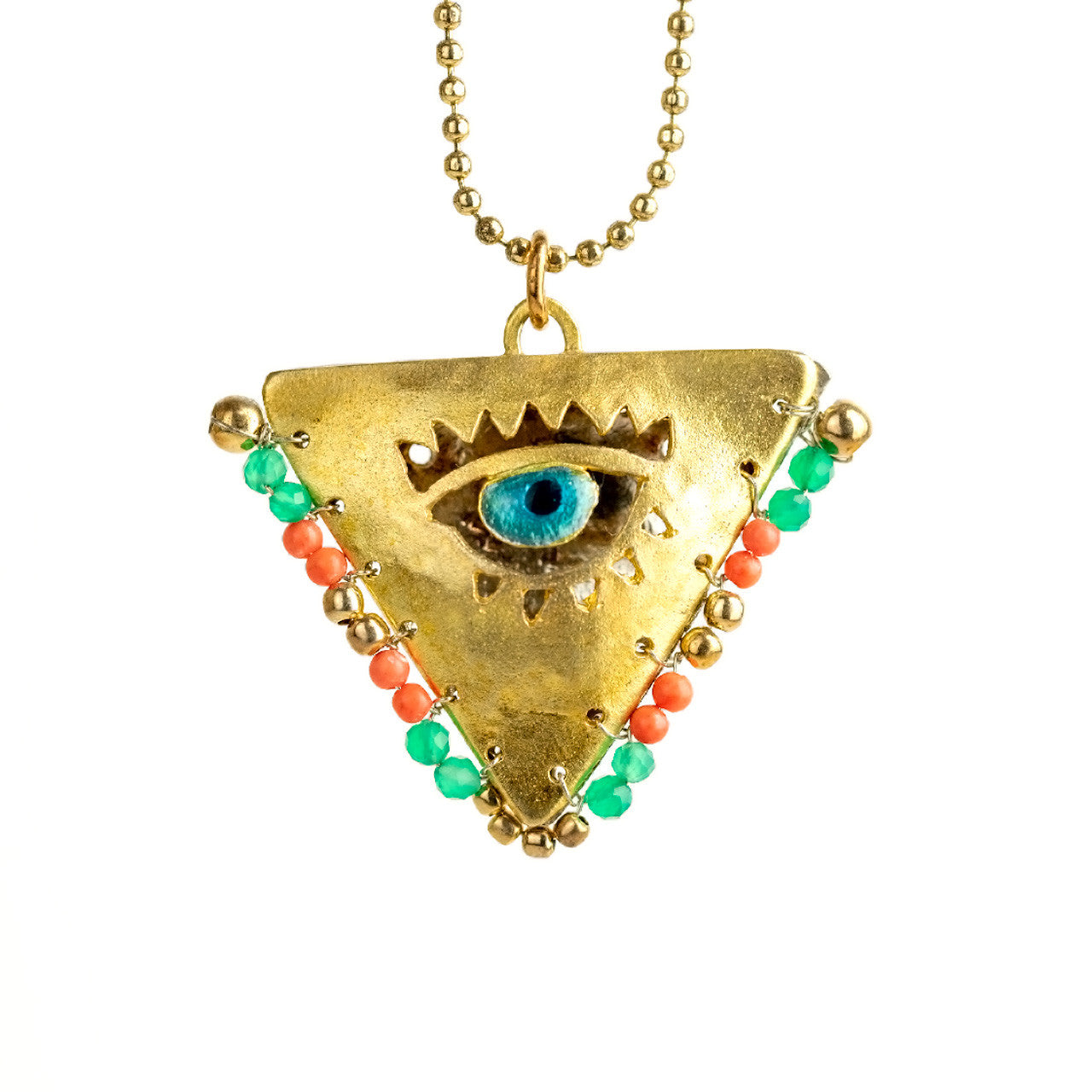 One of a kind, handmade, necklace made from gold-plated silver 925, decorated with a turquoise evil eye and assorted beads in Viridian Green and Coral colour.